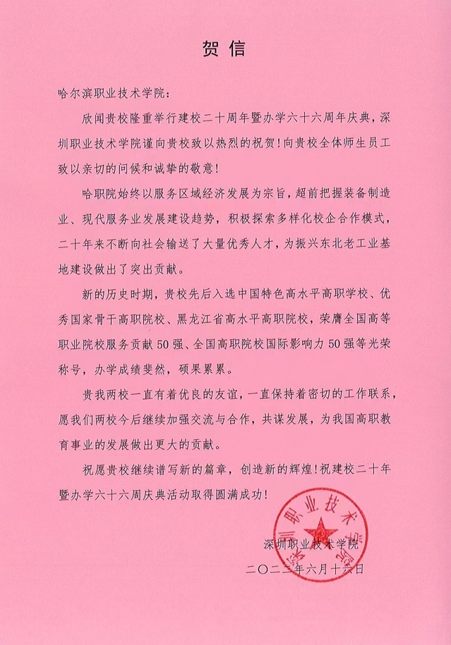 贺信中说,哈职院始终以服务区域经济发展为宗旨,超前把握装备制造业、现代服务业发展建设趋势,积极探索多样化校企合作模式,二十年来不断向社会输送了大量优秀人才,为振兴东北老工业基地建设做出了突出贡献。深职院与哈职院一直有着优良的友谊,保持着密切的工作联系,希望两校今后继续加强交流合作,共谋发展,为我国高职教育事业的发展做出更大的贡献。